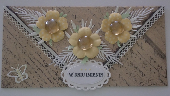 Kolejna kopertówka,do mojej kolekcji.Za oknem zimno,mroźno i wietrznie więc ociepliłam troszkę moją kopertówkę słonecznym kolorem kwiatki mają szklane środki co doskonale obciążyło zamknięcie,obyło się tym razem bez wstążeczki :) Dziękuję wszystkim za pozostawione komentarze które dają pozytywną energię do tworzenia kolejnych karteczek:)))