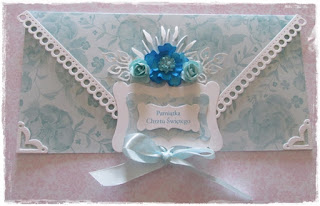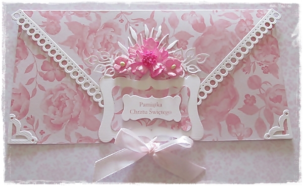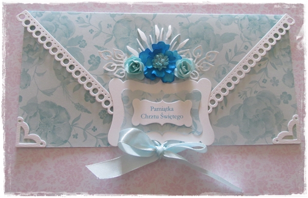 Dwie kopertówki na Chrzest Święty w wersji dla chłopca i dla dziewczynki,powstały z papierów Gra w kolory Galeria papieru mają prześliczny delikatny wzór kwiatowy.Całość dopełniają małe narożniki Die'sire