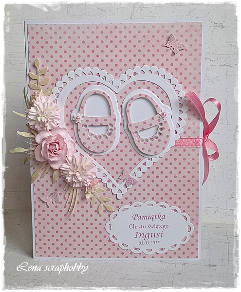 Witam po dłuższej przerwie,chciałam pokazać Wam książeczkę na chrzest dla dziewczynki,książeczka cała w kropeczki z przesłodkimi bucikami od Marianne Design.