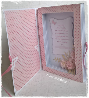 Dziś przedstawiam komplecik na Chrzest Św. cały w różyczki.W skład kompletu wchodzi pudełko eksplodujące i pudełeczko na biżuterię,a wszystko zapakowane w torebeczkę którą również ozdobiłam papierami LemonCraft.