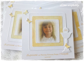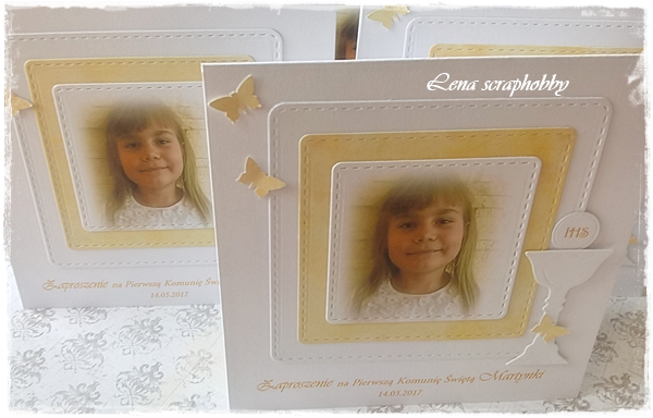 Witajcie:) dziś chciałabym Wam pokazać kolejne zaproszenia komunijne,tym razem dla mojej ukochanej Chrześnicy:) Zaproszenia są bardzo skromne wytłoczyłam tylko papier folderem,powstałam piękna dziewczęca ramka, a w środku umieściłam zdjęcie jedyną ozdobą jest perełka.Co myślicie o takich zaproszeniach,zapraszam do oglądania:)