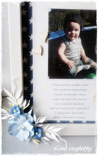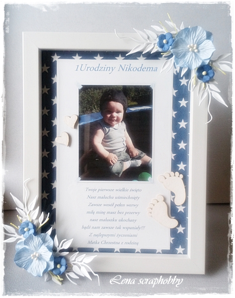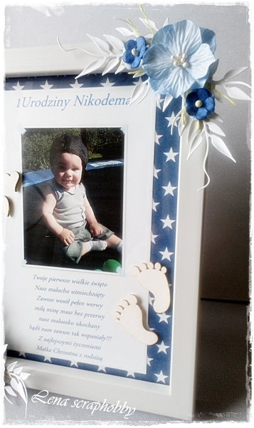 Witajcie dziś pokażę Wam ramkę,którą zrobiłam na 1 urodzinki uroczego chłopczyka.Ramka w spokojnej tonacji biało-niebieska ,słodkie tekturowe stópki ,papier w gwizdki z Galerii Papieru,troszkę mojej pracy i gotowe :)